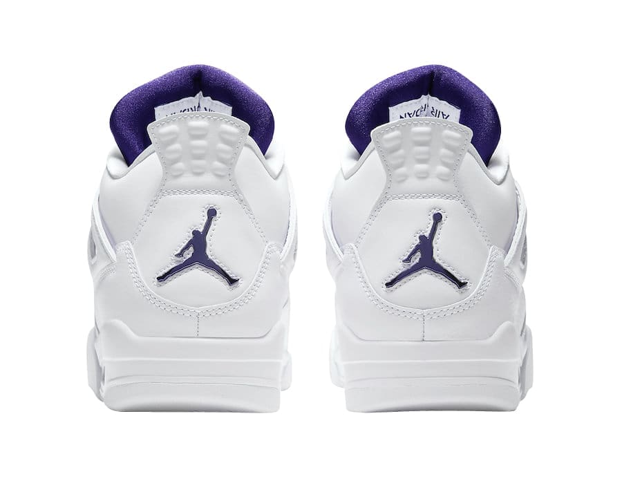 This Jordan 4 features a White leather upper with White mesh underlays and Metallic Purple accents on the upper eyelets. A metallic purple Jumpman logo at the heel, white outsole, and a metallic purple air bubble complete the design.u00a0