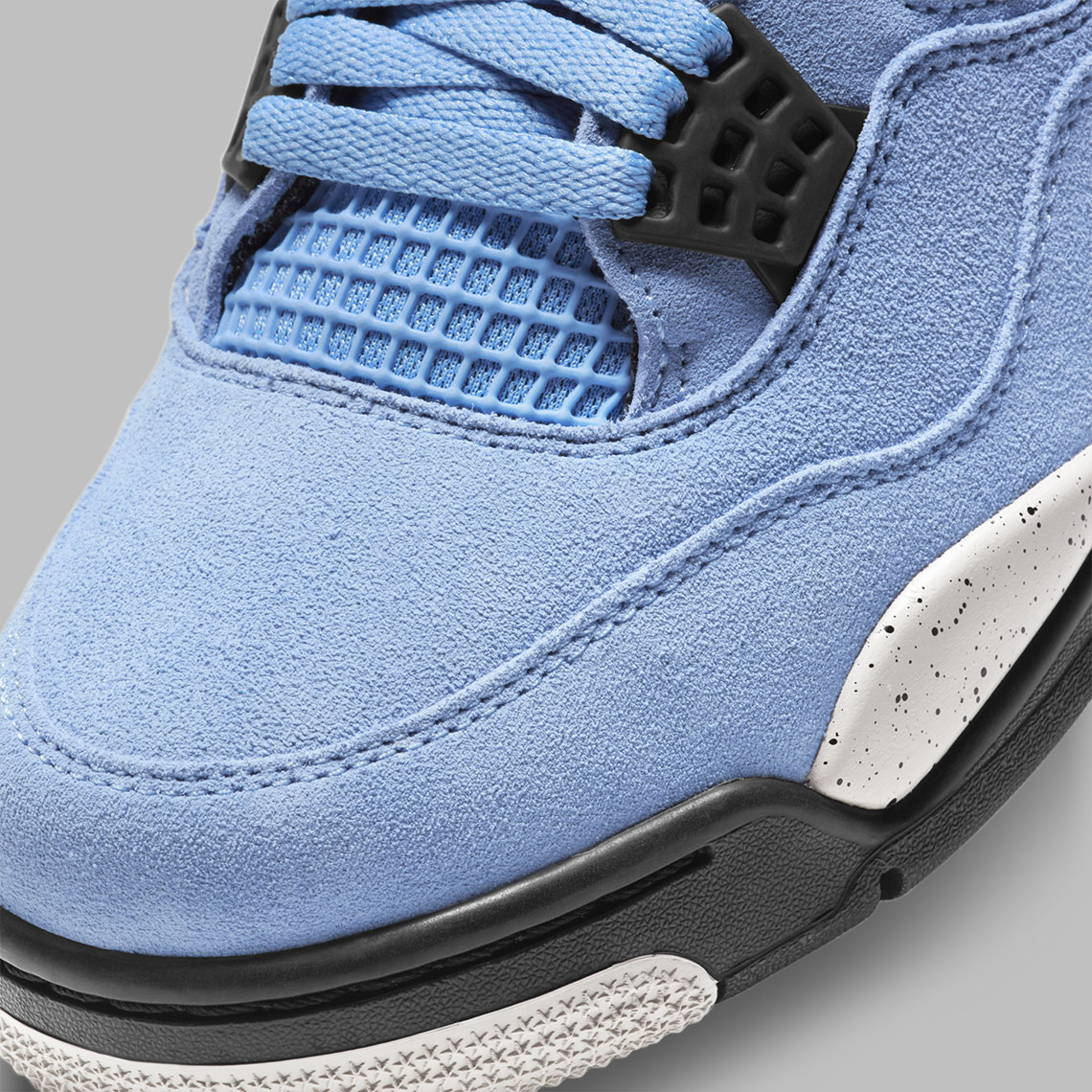 The Air Jordan 4 University Blue features a University Blue suede upper with mesh netting on the quarter panel and tongue. Similar to OG Jordan 4 colorways of the past, the eyelets, heel tab, and sections of the midsole are a speckled Cement Grey. Hits of black appear on the wing eyelets, sole, and Jumpman logo on the heel tab. Two woven labels are stitched to the tongue; one being the classic Jumpman woven label; the other being a Team Jordan jock tag. A black, white, and Tech Grey sole with a clear Air unit completes the design.