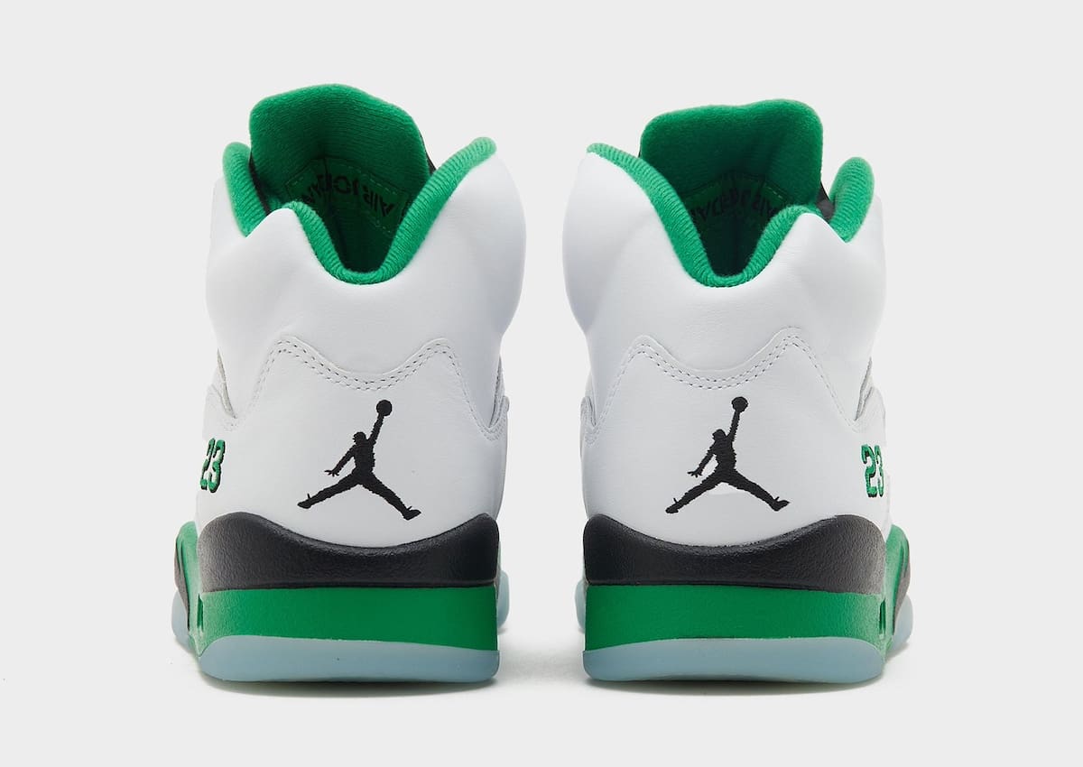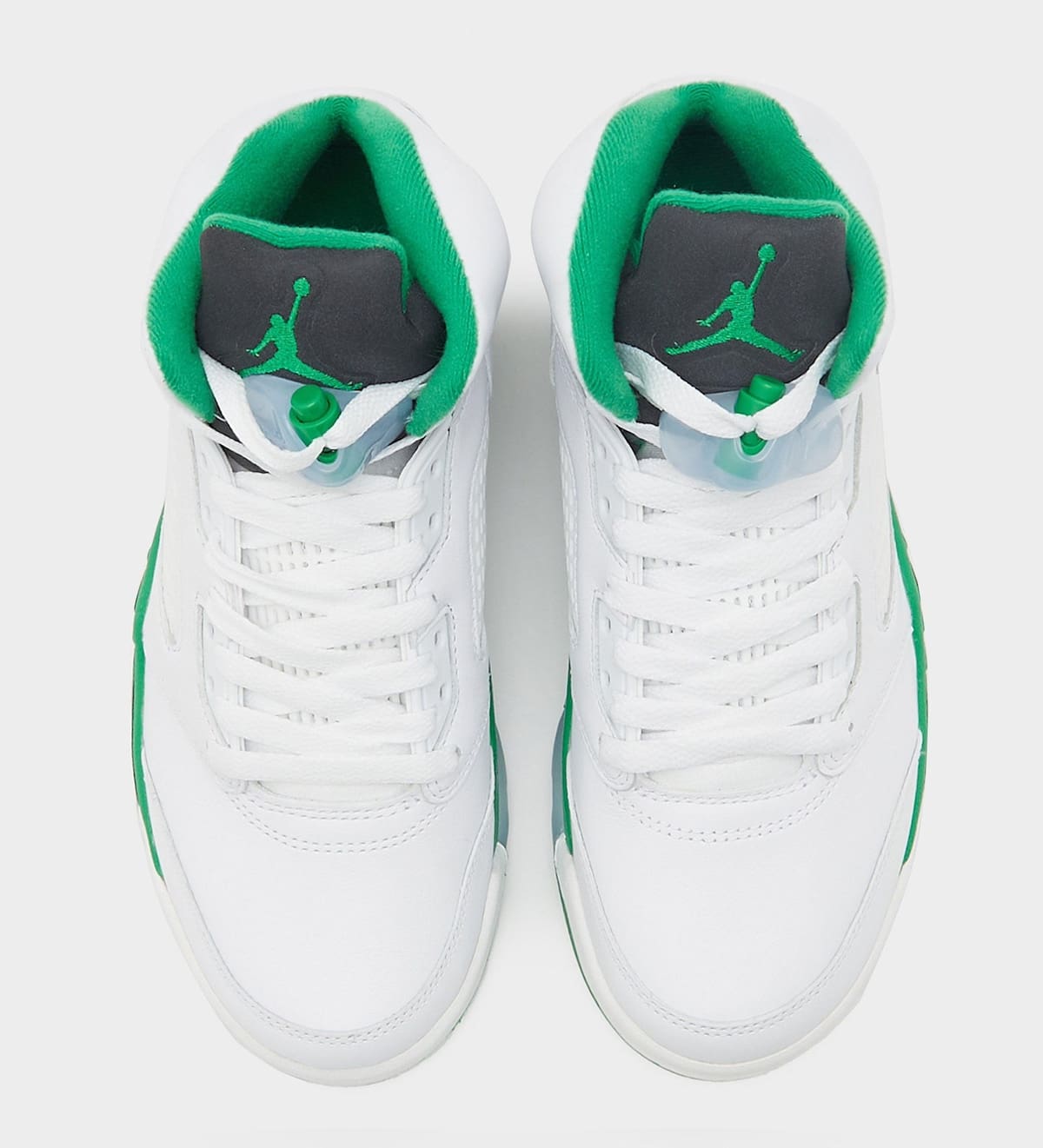 Adorned in White, Lucky Green, Black, and Ice Blue tones, thisu00a0Air Jordan 5u00a0draws inspiration from the classic u201cFire Redu201d Air Jordan 5, known for its Black Tongue design. The shoe showcases a White leather upper, but this time, Lucky Green takes the spotlight. Found on the tongue branding, lace lock, inner lining, and part of the midsole, Lucky Green replaces the traditional Fire Red accents. The Black tongues, upper eyelets, and midsoleu2019s shark teeth stand out alongside the signature u201c23u201d stitched onto the side. The design is finished with an icy translucent outsole.