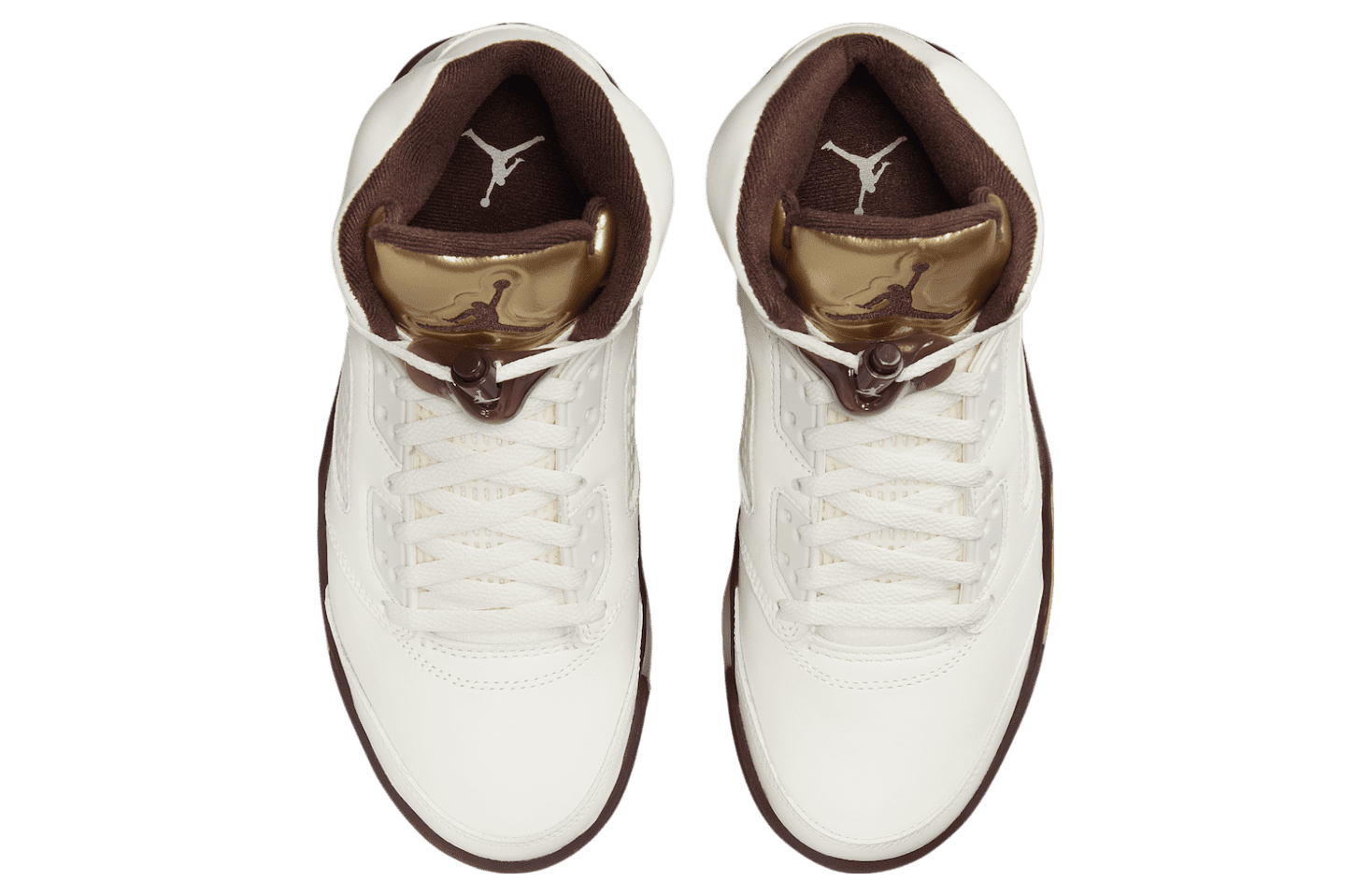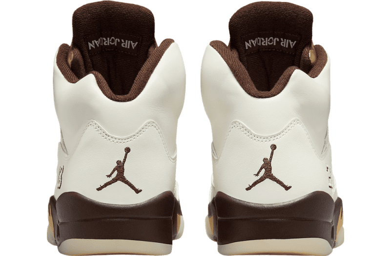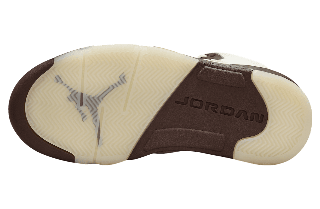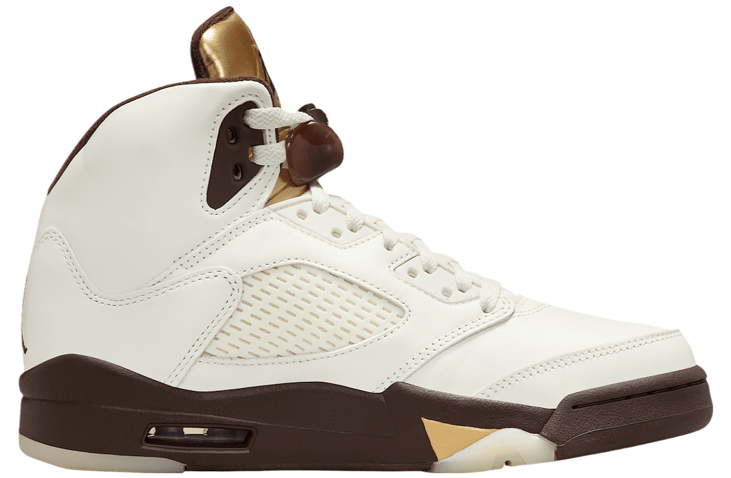 A standout feature is the glossy Metallic Gold tongue, symbolizing the golden ticket that unlocks dreams. This eye-catching detail is paired with a chocolate-brown midsole and a premium Sail leather upper. Together, these elements evoke the indulgent charm of candy while maintaining a sophisticated aesthetic. Earthy tones balance the golden accents, creating a versatile yet striking design. Modern touches like the embroidered Jumpman logo and translucent outsole tie it all together while honoring the Air Jordan 5u2019s iconic legacy.