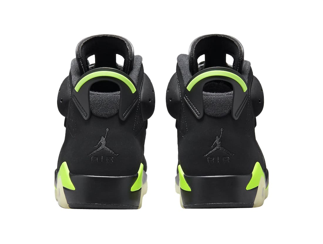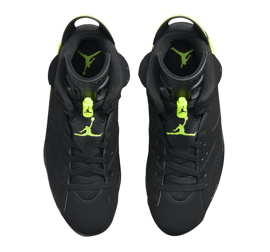 Opting for a simple color blocking, this Air Jordan 6 starts off with a Black base done in nubuck construction with the signature perforations placed throughout the shoe. The defining Electric Green hue is then placed on the Jumpman branding on the tongue, lace locks, midsole, and heel tab. A black midsole, and a black rubber outsole with translucent detailing and a green Jumpman finish things off on this Air Jordan 6.
