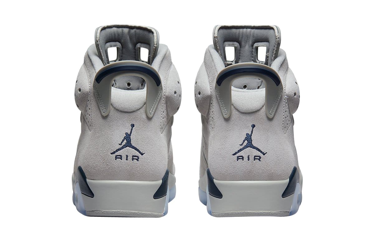 This new Jordan 6 Retro Georgetown colorway gets covered in a full grey suede construction all over the upper with tonal detailing placed on the laces, tongues, inner liner, heel tabs, and the midsole. To complete the Georgetown look we see the addition of College Navy on the lace lock, Jumpman logos on the tongues, heel tabs, and the mountain peaks on the midsole. Perforations on the side panels and icy blue rubber outsoles finish off the look on this Air Jordan 6