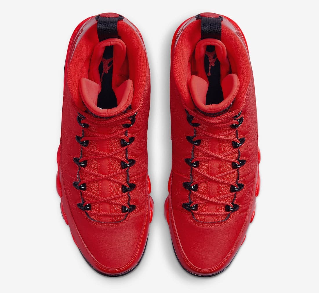 Dressed in a Chile Red and Black color scheme. Thisu00a0Air Jordan 9u00a0resembles theu00a0Air Jordan 9 u201cMotorboat Jonesu201du00a0from 2012u2019s Kilroy Pack. It features a quilted stitched upper atop a glossy midsole with a patent leather mudguard.