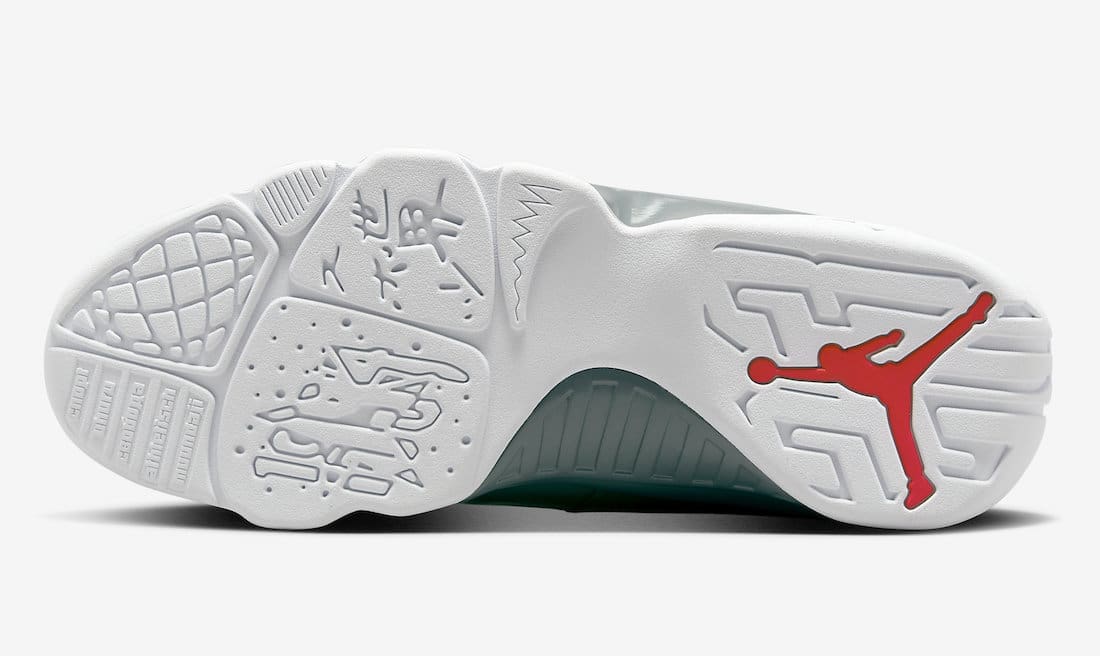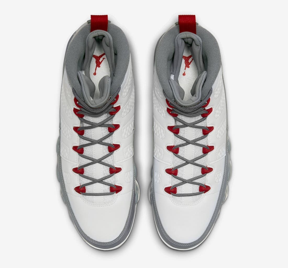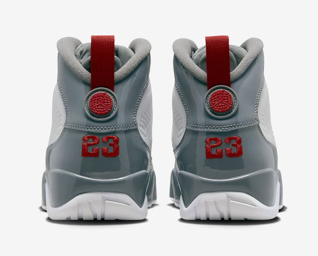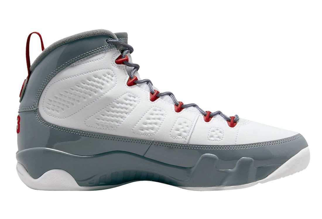 Dressed in a White, Fire Red, and Cool Grey color scheme. This offering of theu00a0Air Jordan 9u00a0features a White leather base with Grey patent leather overlays and Red contrasting accents. A glossy Grey midsole atop a White rubber outsole completes the design.