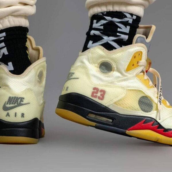 Made in collaboration with Virgil Abloh��s luxury streetwear label, the Off-White x Air Jordan 5 Retro SP ��Sail�� represents the follow-up to the partner brands�� black AJ5 from early 2020. This pair makes use of a layered textile upper in a subtle cream finish, complete with circular cutouts on the midfoot, collar and silver reflective tongue. Virgil��s signature flourishes, including printed Helvetica text on the medial side panel, complement ��23�� and Nike Air branding on the heel. A pre-yellowed translucent outsole adds to the sneaker��s vintage aesthetic.