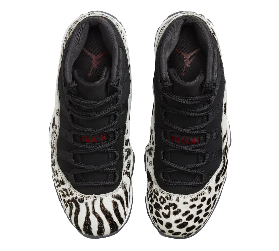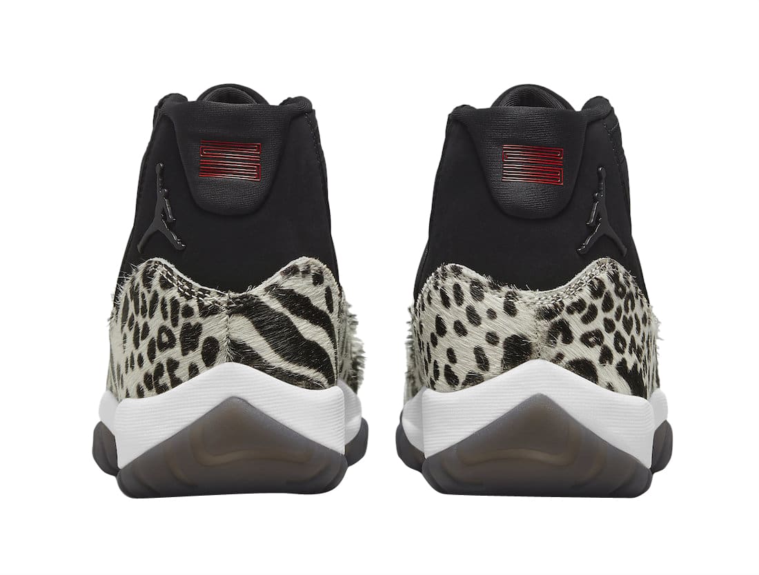 This new colorway of the Air Jordan 11 starts off with a Black suede construction on the upper which is then hit with a Sail and black textured fur on the signature mudguards in a few different animal prints. Additional details include red branding on the tongues and heels, black metal Jumpman logos on the ankles, a White midsole and smoky translucent outsoles.