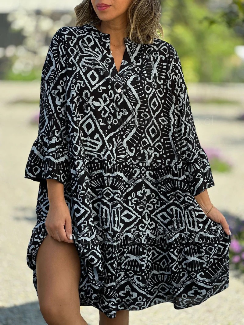 V-Neck Flared Sleeve Romantic Print Splicing Dress For Women